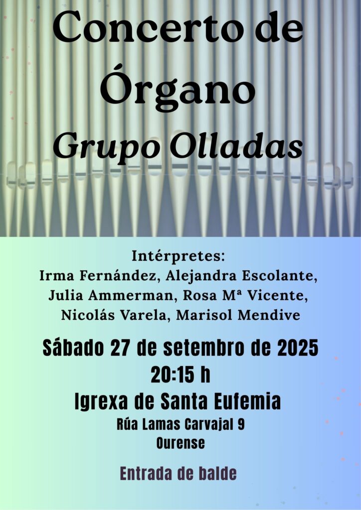 El próximo sábado, 27 de septiembre, a las 20:15 h. en la iglesia de Santa Eufemia do Centro tendrá lugar un concierto de órgano a cargo de organistas que forman el grupo Olladas: Julia Ammerman, Alejandra Escolante, Irma Fernández, Marisol Mendive, Nicolás Varela y Rosa Mª Vicente.